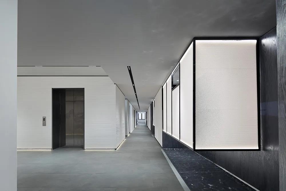 核心筒采用水泥肌理板加成品踢腳燈帶,