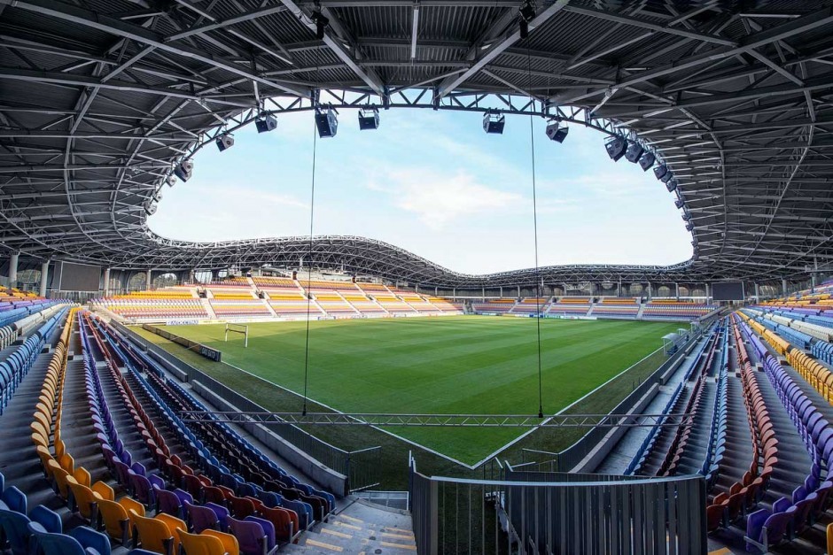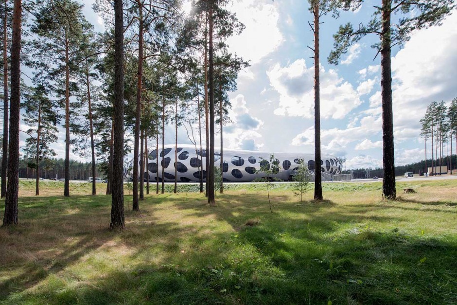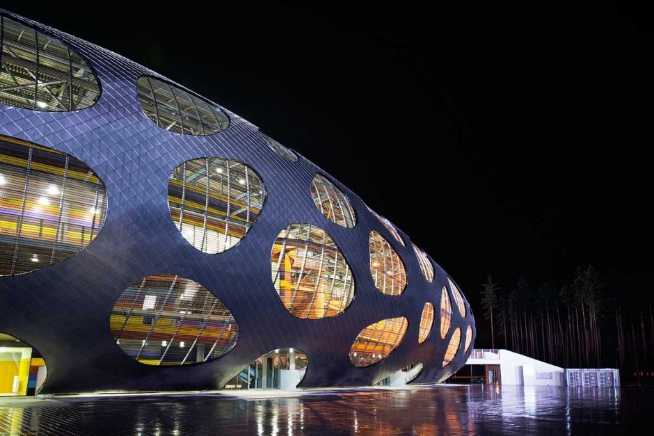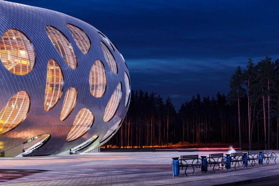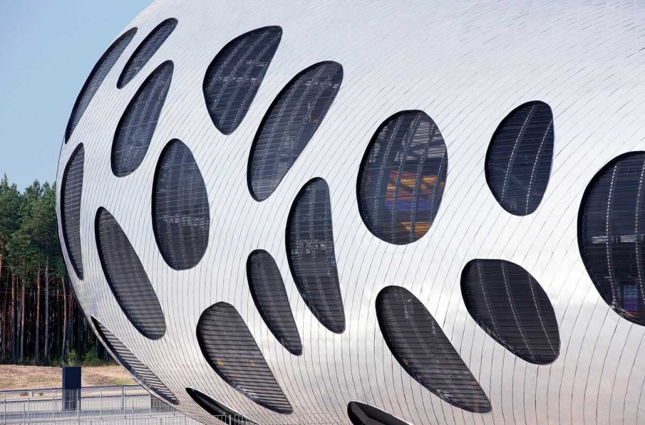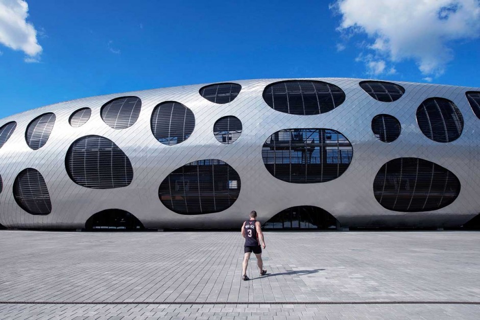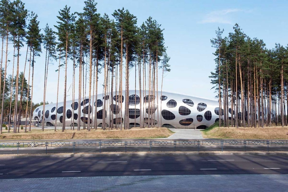 來自斯諾文尼亞的建筑設(shè)計(jì)公司 OFIS Architects 早前受委托在白俄羅斯鮑里索夫當(dāng)?shù)卦O(shè)計(jì)建造一個(gè)前衛(wèi)而壯觀的大型足球場。足球場坐落在一大片綠樹環(huán)繞的樹林中心,扁平而圓滑的奇特造型由光滑的銀白色鋼化外墻面板以及不規(guī)則穿孔的結(jié)構(gòu)框架所組成;而球場共有 7 個(gè)樓層,共可以提供 13,000 個(gè)觀眾親臨現(xiàn)場感受比賽,而 85 米 X 105 米尺寸的綠蔭球場加上世界級(jí)的頂尖室內(nèi)音響聲效,無疑成為世界足球迷的最為期待親臨的球場之一。