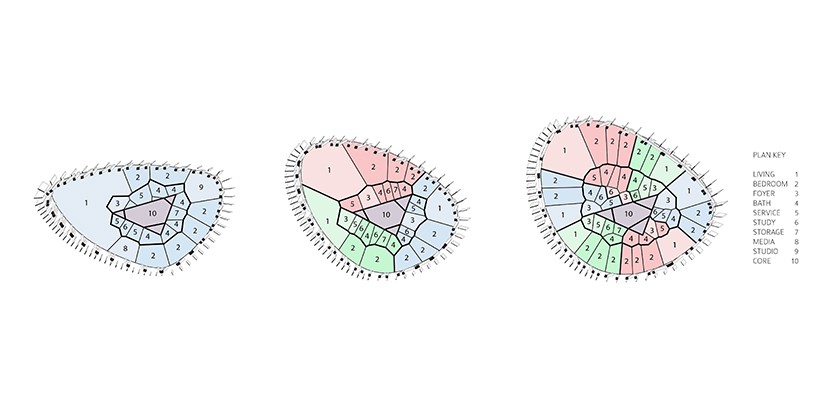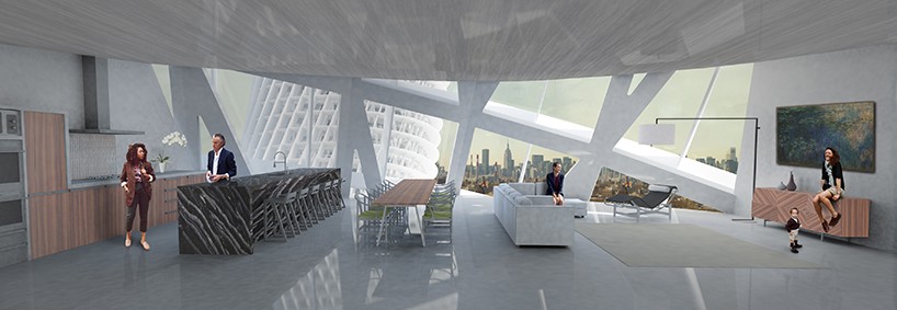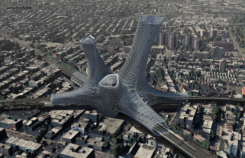 該項目很有優(yōu)勢,那就是住房離交通樞紐很近, 目前的選址是在長島鐵路和第七列車的交匯處。規(guī)劃有序的混合板材突出了幾何設(shè)計, 從圓柱過渡到三角形,從底部到頂部,每棟樓都層次鮮明。外部的合金設(shè)計靈活多變,觀賞性強,每個節(jié)點都有獨特的曝光度。整體的布局展開來看,就是一張網(wǎng),罩住了下面的交通樞紐。在每個網(wǎng)格節(jié)點處, 都有最佳的遮蔭效果和日光傳輸設(shè)計。根據(jù)實際需求,建筑表面的節(jié)點會張開橫向和縱向的金屬“魚鰭”, 這種獨特的金屬設(shè)計美化了外觀,會隨著光照角度的變化而變化。