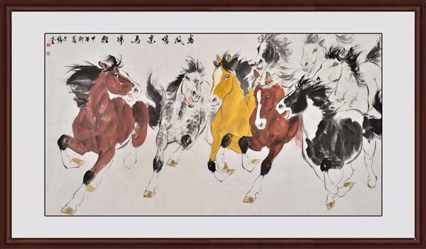 1:駿馬的軀干、四肢、腿蹄酣暢淋漓地繪之于畫幅中,一路飛馳向前,將八匹駿馬瞬間的動作巧妙地繪之其畫,體現(xiàn)出奮發(fā)向上、豪邁進取的精神,體現(xiàn)中國人志氣、拼搏的進取精神,乃精品畫作;