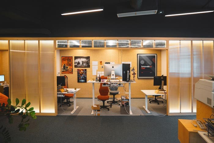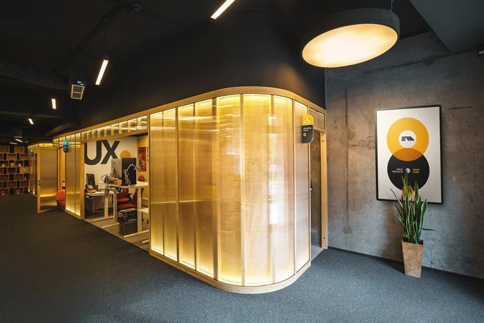 編碼室的設(shè)計:內(nèi)外之間有一種別樣的感覺,外部空間以暗色為主,內(nèi)部空間以暖色為主,兩種色彩相互結(jié)合在一起,卻給我們展現(xiàn)了神奇的一面,暗色的頂與過道給程序員營造了一個絕對安靜的空間氛圍,暖色系讓空間更加的溫馨,這樣的搭配主要就是希望給程序員一種家的感覺,消除程序員的煩躁與無聊。