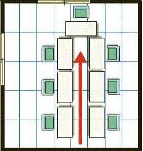 辦公室的座位安排也必須要花點(diǎn)心思,上圖是【一箭穿心】,對(duì)被沖的人必然不利,若被沖的人是老板或者是單位的主管,則會(huì)影響全公司或者改部門的全體運(yùn)勢(shì)。